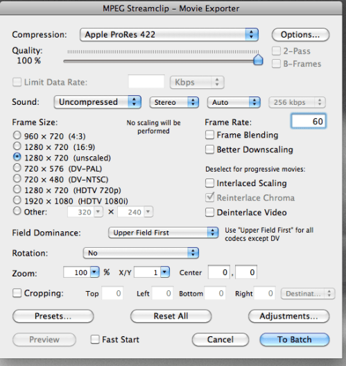 Now, these settings can obviously be altered if you are shooting at either of the 1080 resolutions. Streamclip will automatically adjust your Frame Size accordingly, all you have to do is type in the Frame Rate. When this is done, go ahead and hit “To Batch” and then “GO”.