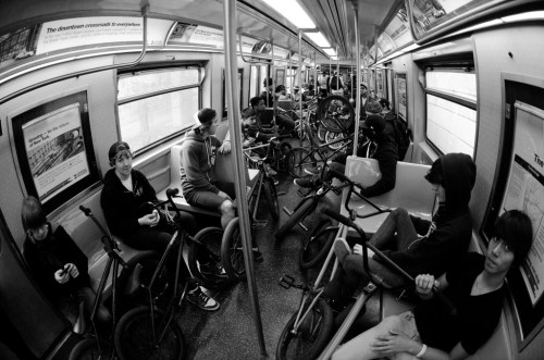Possibly one on my favorite photos of 2011. One of the two train cars filled with bmx riders at the Group Home Bikes train jam.