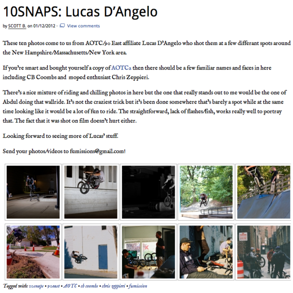 I was lucky enough to get asked to do this week’s 10snaps for BMXFU. These photos were either shot on my Canon 7D, Nikon F3, or Yashica Electro35. My favorite is definitely the one of Abdul doing a wallride. I need to shoot more film…