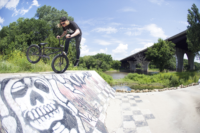Cody Smiglewski, Footjam Whip in Bloomington, MN. A few of us had heard rumors of this DIY drainage bank spot, but no one knew exactly where it was. A quick Google Satellite search turned up a possible hit that ended up panning out along the banks of the Minnesota River. After cleaning up a bit of the crust and sand, the spot was ready to ride and Cody pulled off the move of the mission.