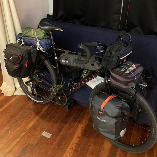 My bike is a Fairdale Weekender Archer to which I’ve attached a Fairdale Adjust-A-Rack to the rear and a Surly rack to the front. I switched out the stock seat for a differently shaped one (I have relatively narrow sit bones) and I use padded cycling shorts when I ride. I also added drop-bar attachments so that I can get more aerodynamic if I want to. My rear panniers are some old-school Cannondale bags that I got at a yard sale years ago and on the front racks I have Ortlieb waterproof bags. I also have an Ortlieb frame bag where I keep tubes and tools, a burrito bag strapped to the handlebars and a soft, insulated lunchbox that sits on top of the front rack. Strapped to the rear were my one-person tent and inflatable sleeping pad.
